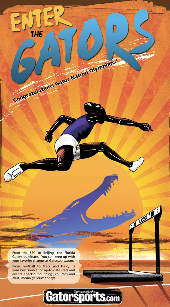 A full page ad, part of a campaign series to promote Gatorsports.com and the coverage of University of Florida athletes at the 2008 Beijing Summer Olympics. Won 2008-2009 Local Silver ADDY for Campaign-Self Promotion.