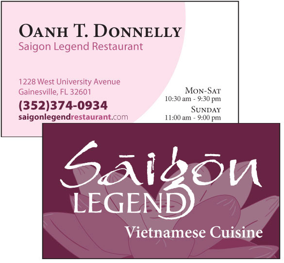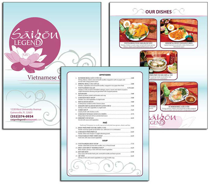 Logo design and branding package for Saigon Legend Restaurant in Gainesville, Florida. The branding included photography for house specialty dishes as well as menu design.