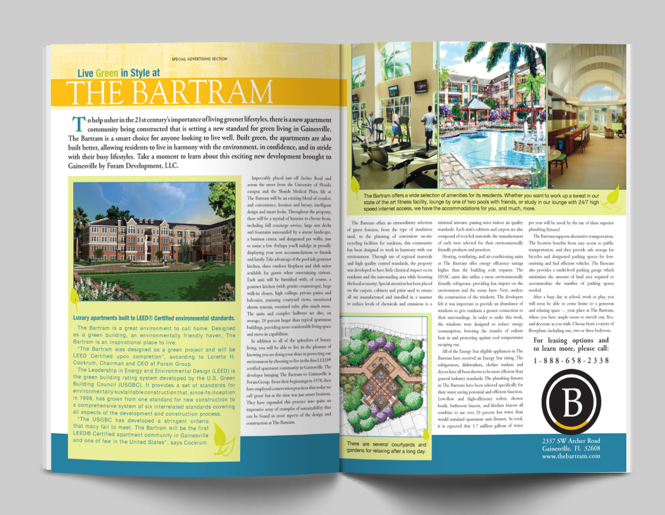 Two-page advertising spread for The Bartram in Gainesville Magazine. Won 2009 Local Silver ADDY.